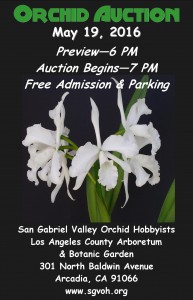 The San Gabriel Valley Orchid Hobbyists Society is going to be having its Annual Orchid Auction on Saturday, May 19th, at the Los Angeles County Arboretum and Botanic Garden. Preview will begin at 6pm; the auction will begin at 7pm. Parking and admission are both free. We hope to see you there!